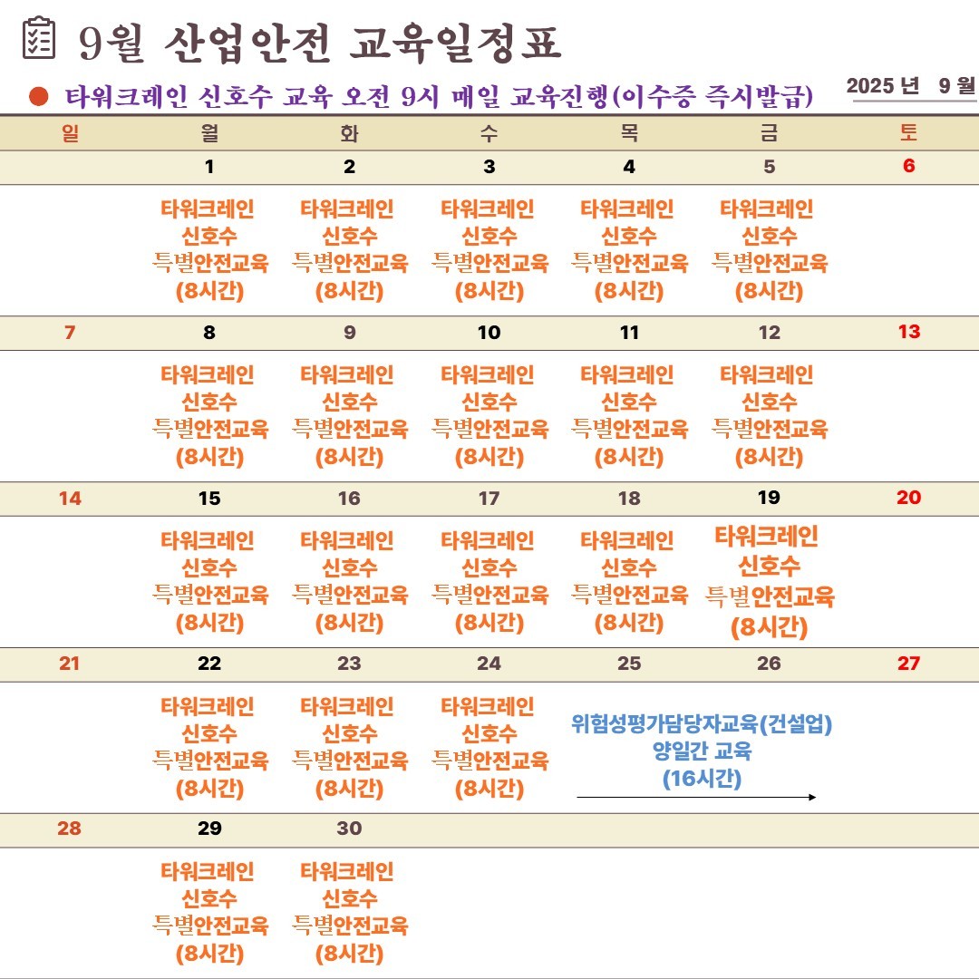 25년 9월 교육일정안내( 타워크레인 신호수 교육 - 매일 진행)