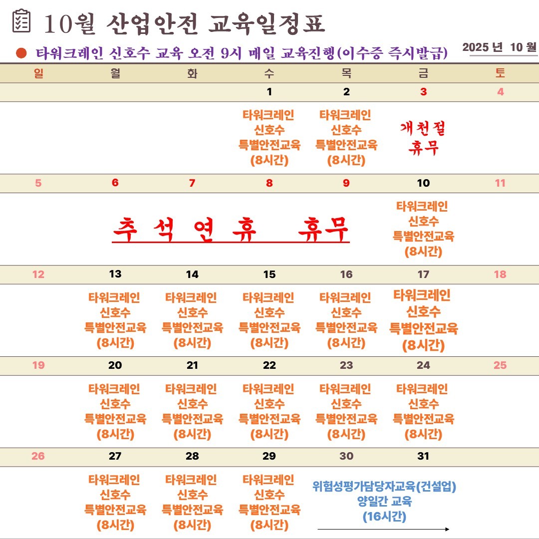 25년 10월 교육일정안내 (타워크레인 신호수 교육 매일 진행)